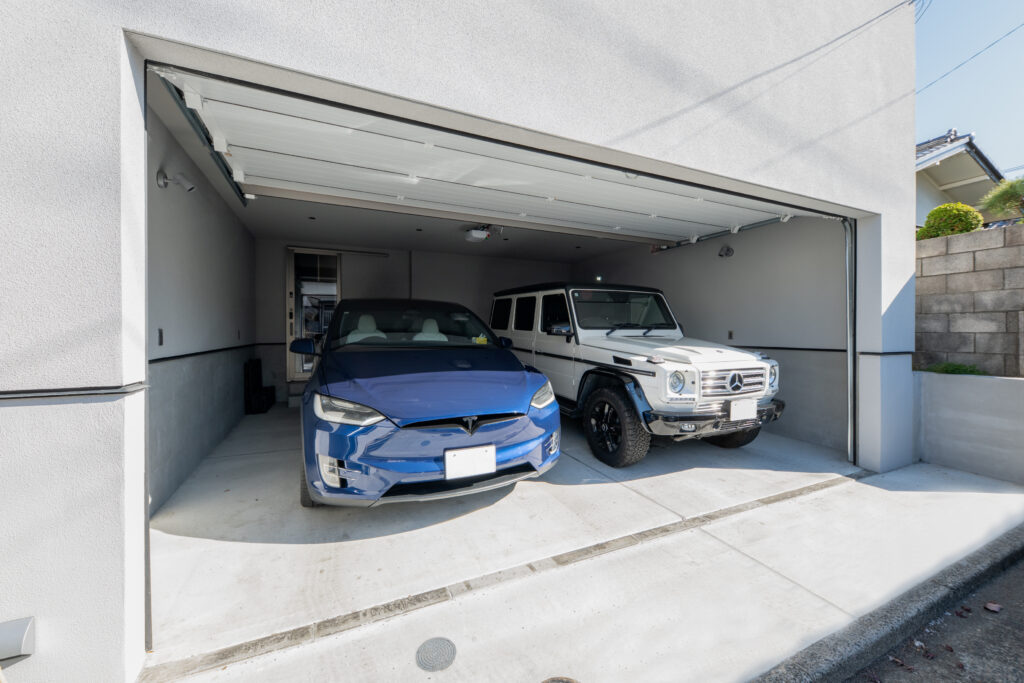 RC深基礎と高度な構造計算により、柱のない大開口ビルトインガレージを実現。敷地の高低差を逆手に取り、複数台の並列駐車を可能にした、機能美あふれる邸宅です。