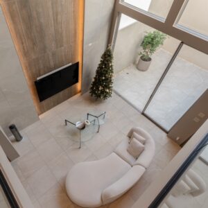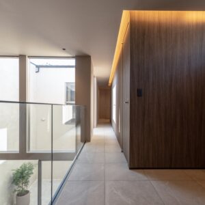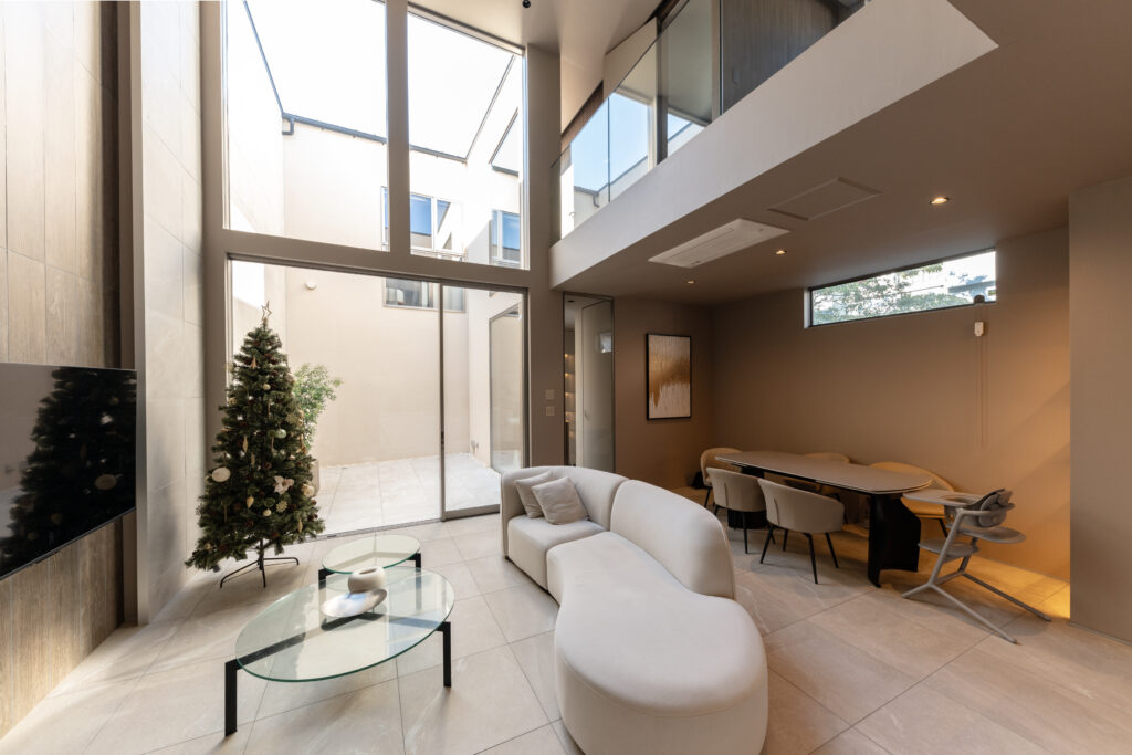 他社では「構造的に不可能」と判断されたハイサッシの採用を実現するため、木造に鉄骨の強さを取り入れた「混構造」という解答を導き出しました。 緻密な構造計算により、視界を遮る柱や耐力壁を排除。天井とサッシのラインをミリ単位で揃えることで、室内と中庭がフラットにつながる、ノイズのない美しい大空間を実現しています。