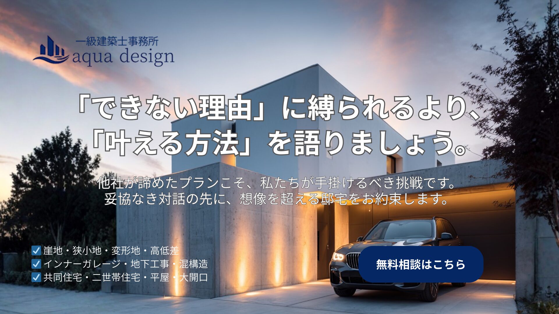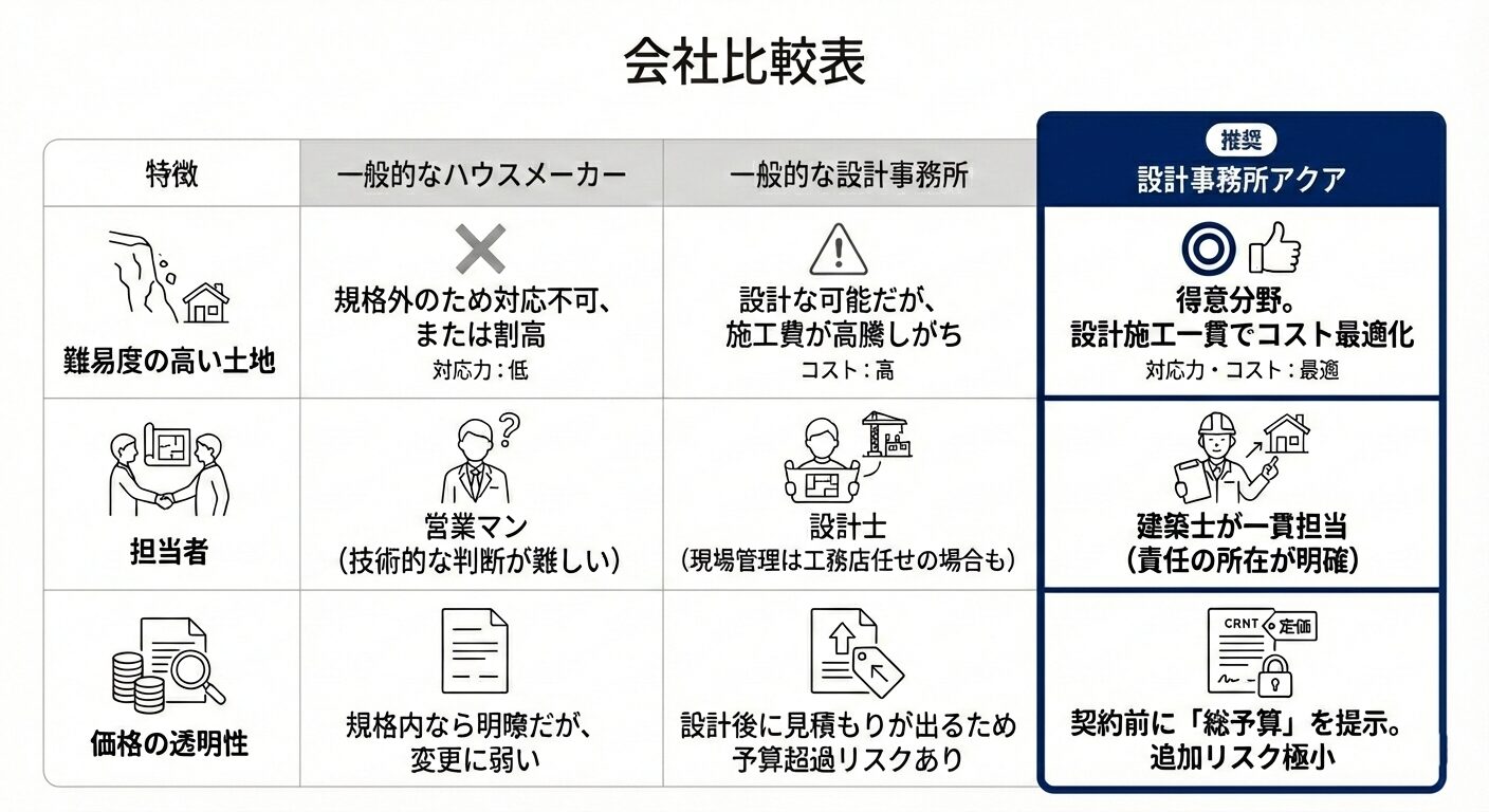 A. 「アクアの得意とする分野です。」- 他社で断られた土地や、難条件の土地こそ、設計のアイデアで化ける可能性があります。ぜひ一度拝見させてください。