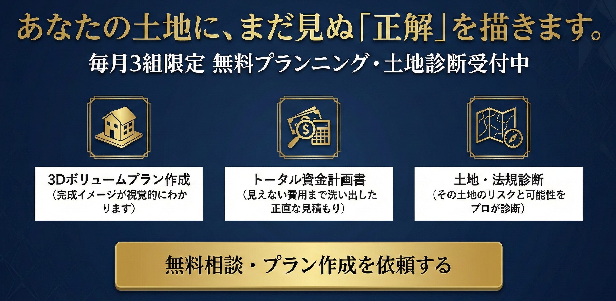 他社で断られた難条件。規格外のこだわり。 それらはすべて、唯一無二の「資産価値」ある邸宅を生み出すための、大切な手がかりです。